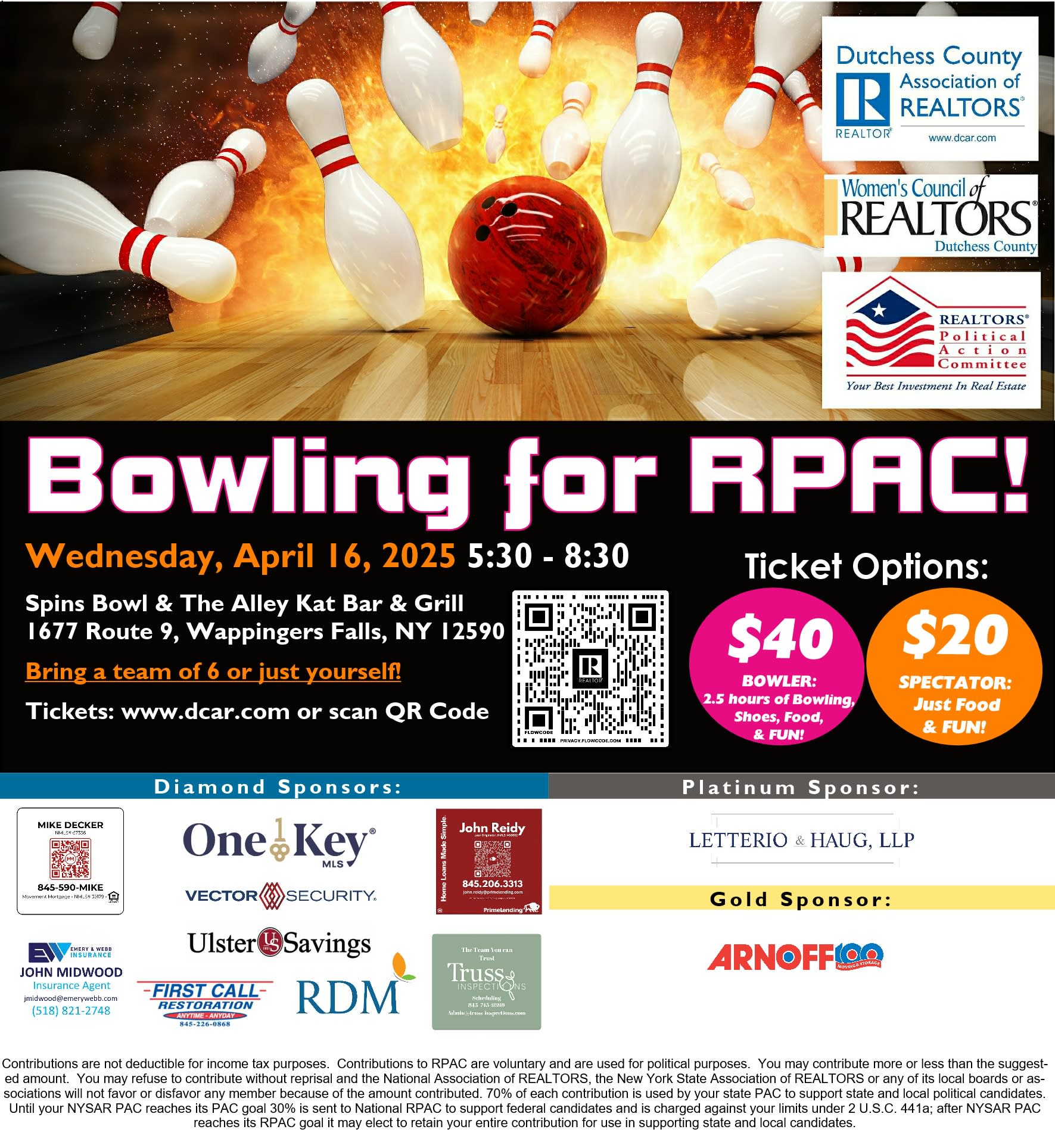 Get ready to roll (or cheer) for a great cause! Join us on Wednesday, April 16, 2025, for our annual Bowling for RPAC event at Spins Bowl & The Alley Kat Bar & Grill, 1677 Route 9, Wappingers Falls, NY 12590, from 5:30 PM to 8:30 PM.